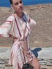Lilia is warm toned stripes and floral motifs set against a soft ivory base. The Lilia Mini Dress is a relaxed fit featuring a boat neckline, a waist tie for adjustable shape and a softly draped wrap-style skirt. Effortless and feminine, it’s designed to move with ease through warm-weather days. Style with sandals for easy daytime dressing, or elevate with heels for an understated evening look.